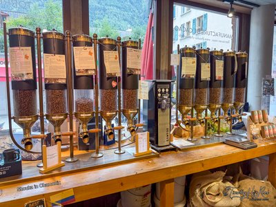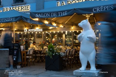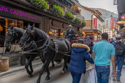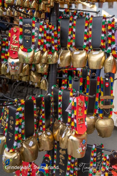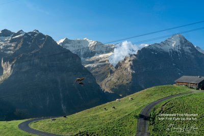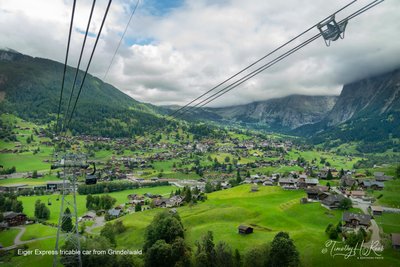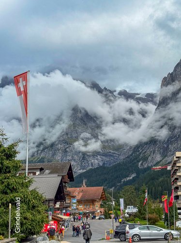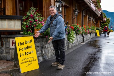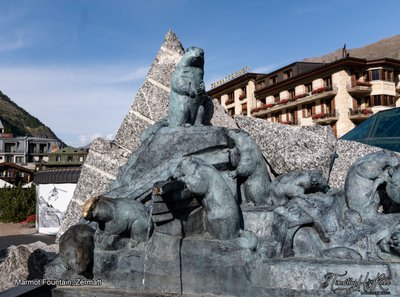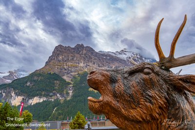 Statue of an early skier in Grindelwald village centre, the Eiger mountain in the background.