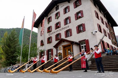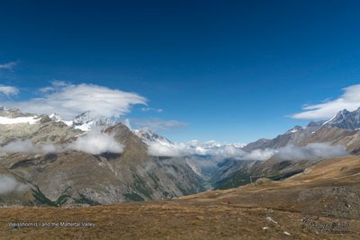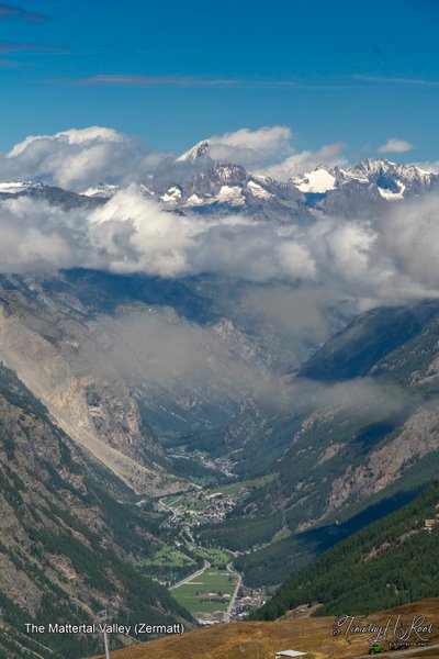 Mattertal Valley in the Swiss Alps. The Hobärggletscher glacier visible at the head of the valley.